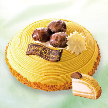 マロンチップをホイップクリームでサンドしマロンクリームで仕上げました。サイドにアーモンドチップをコーティングしました。