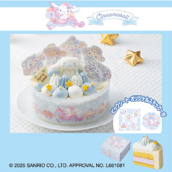 チーズムースの土台に、雲をイメージしたシナモロールカラーのクリームを絞ったオリジナルケーキ。シナモロールはマシュマロでモチモチふわふわ食感です。