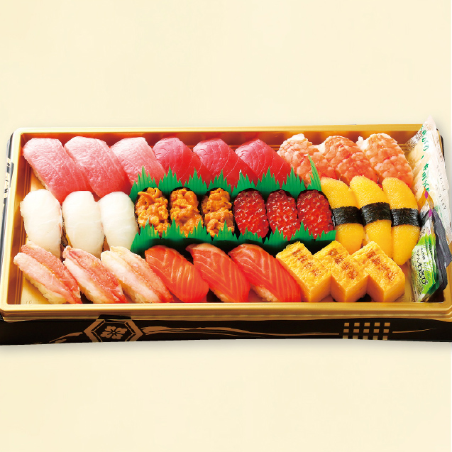 大トロ・まぐろ・蒸しえび・湯引き鯛・うに・いくら・数の子・ずわいがに・サーモン・玉子焼き